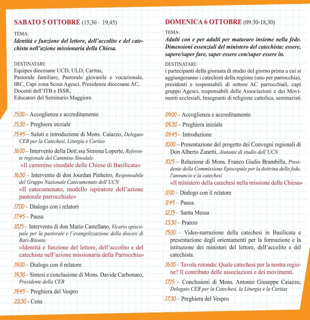 Il Convegno regionale catechistico intende seguire tre principi che ne determinano la scansione e la finalità: riconoscere, interpretare e scegliere. Riconoscere, intende porci all’interno delle questioni in gioco, a partire dai cambiamenti in atto per quanto riguarda l’annuncio e la catechesi. Per questo la prima parte del convegno è una giornata di studio sabato 5 ottobre. Saremo aiutati dalla Dott.ssa Simona Loperte, Don Jourdan Pinhero e don Mario Castellano. Interpretare, ci introduce al tema dei criteri attraverso i quali immaginare la comunicazione del Kerygma, avendo come riferimenti fondamentali la Scrittura e l’ascolto di narrazioni che mettono in evidenza la forza attrattiva dell’annuncio. Questo principio verrà sviluppato nella relazione di Mons. F. G. Brambilla, dalla video narrazione che illustrerà la catechesi in Basilicata e dalla tavola rotonda in cui si confronteranno i responsabili regionali dei principali associazioni e movimenti ecclesiali presenti in regione. Scegliere è il momento dedicato all’elaborazione di alcuni passi orientativi in vista di un annuncio rinnovato e adatto per l’oggi. Il Convegno non deve essere un evento fine a sé stesso ma la tappa iniziale per l’elaborazione di linee regionali per la evangelizzazione e la catechesi di ispirazione catecumenale.